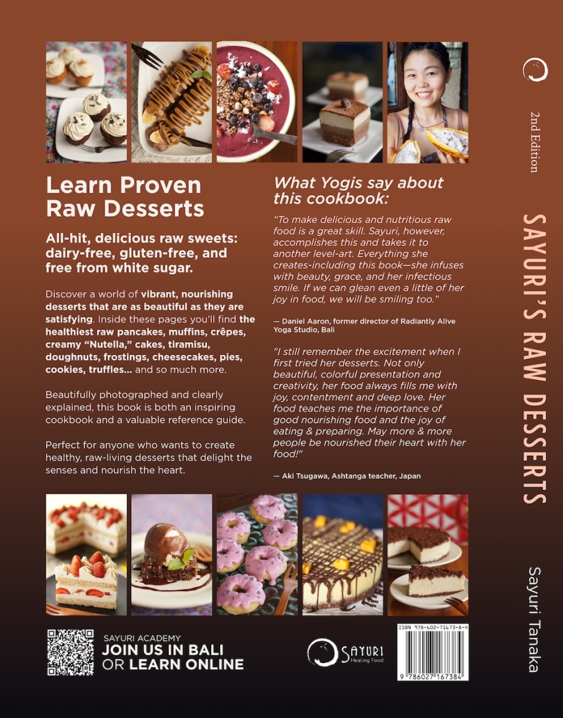 Banana pancakes, crepes, fig compote, “Nutella,” vanilla whip, silky mousses and puddings, layered cakes, tiramisu, doughnuts, swirled cheesecakes, gooey pies, cookies and biscuits, handmade chocolates, “Snickers” bars, truffles, bliss balls, and dreamy ice creams with banana splits—all made with whole ingredients, enzymes intact, and absolutely bursting with joy.